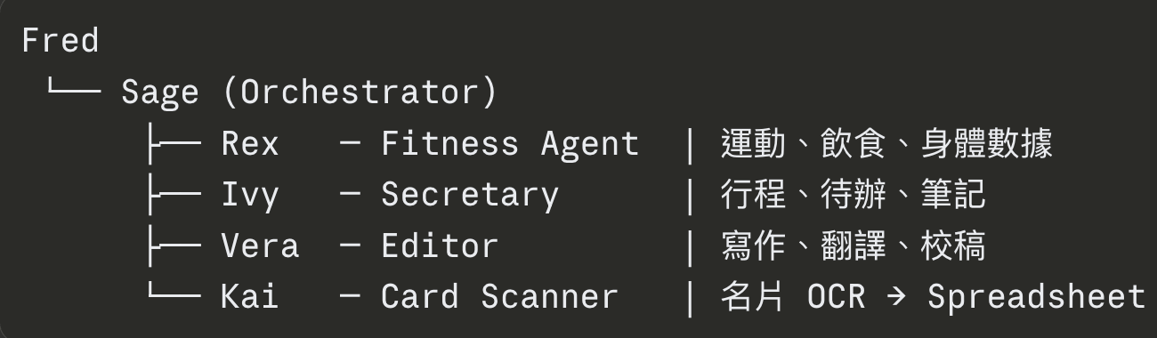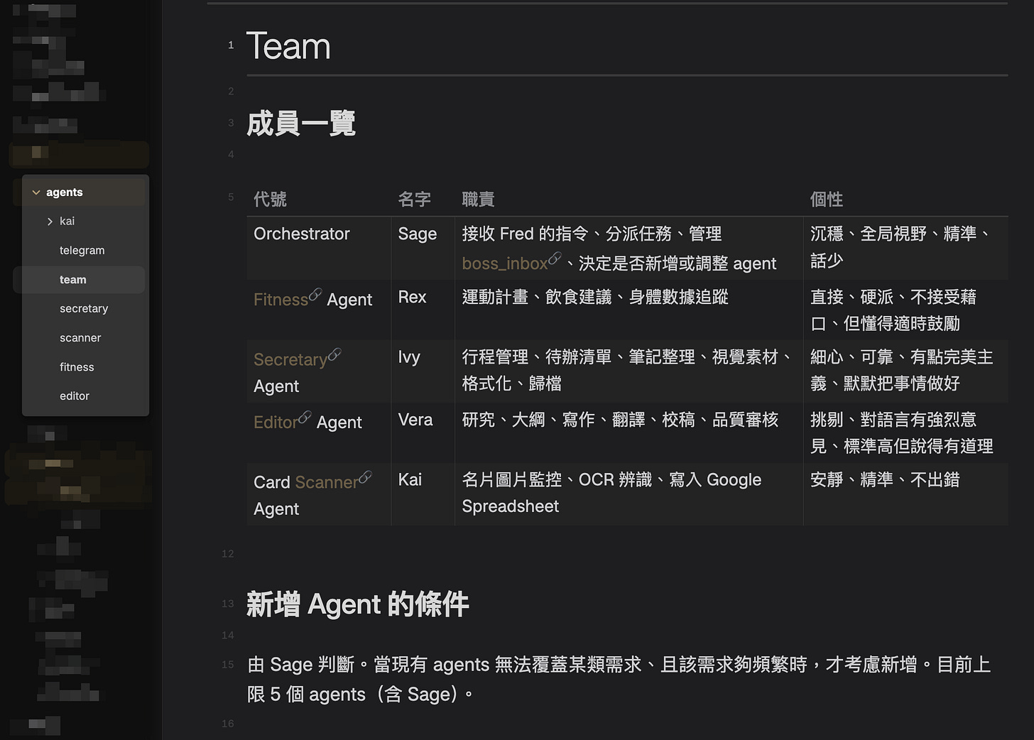 所以假設我們有一個主管、一個秘書,它們的定義檔分別是「主管.md」和「秘書.md」(.md來自markdown文件的副檔名);你也可以幫它們取名字,以後方便呼叫。